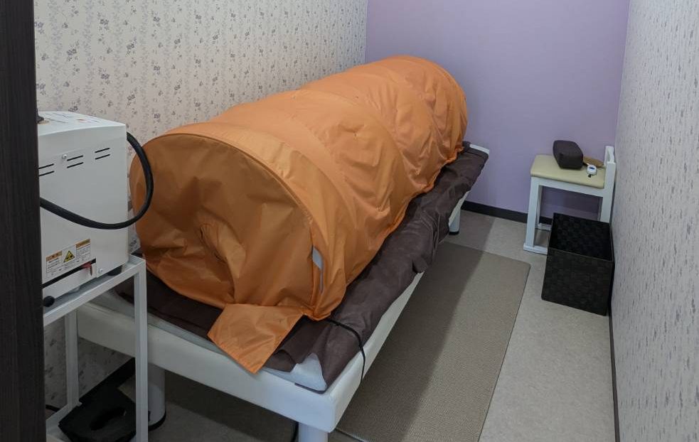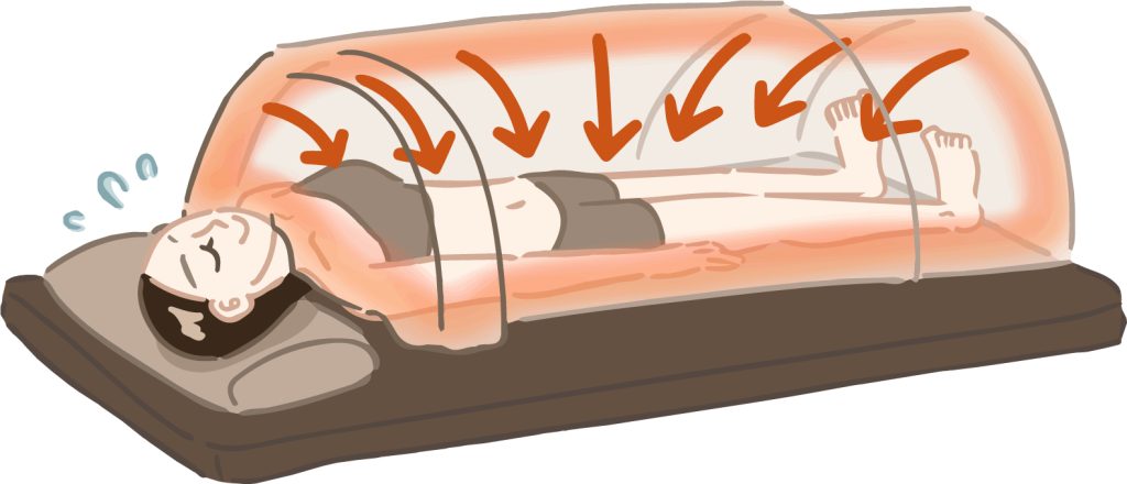 からだは温まると、副交感神経が優位になり、呼吸が深くなり、末端の血のめぐりが回り出します。「冷え→こわばり→睡眠質の低下→翌日の疲れ」という負のループを、まずは温度でやさしく断ち切る。 当サロンのドームは40〜45℃の低温域。息苦しさが少なく、敏感な方でも続けやすい設計です。